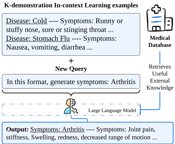 In the initial phase of our implementation, we system a tic ally extract symptom features from a range of diseases by harnessing the in-context learning capabilities of LLMs. Figure 2 shows an examples of the corresponding workflow. We first prompt the model with a series of examples, such as "disease: cold, symptoms: runny or stuffy nose, sore or tingling throat, cough, sneeze", to teach it the pattern generated by the symptom profile. Leveraging this in-context learning paradigm, our system is ready to take new query inputs and efficiently produce symptom descriptors for various diseases in a batch processing mode.