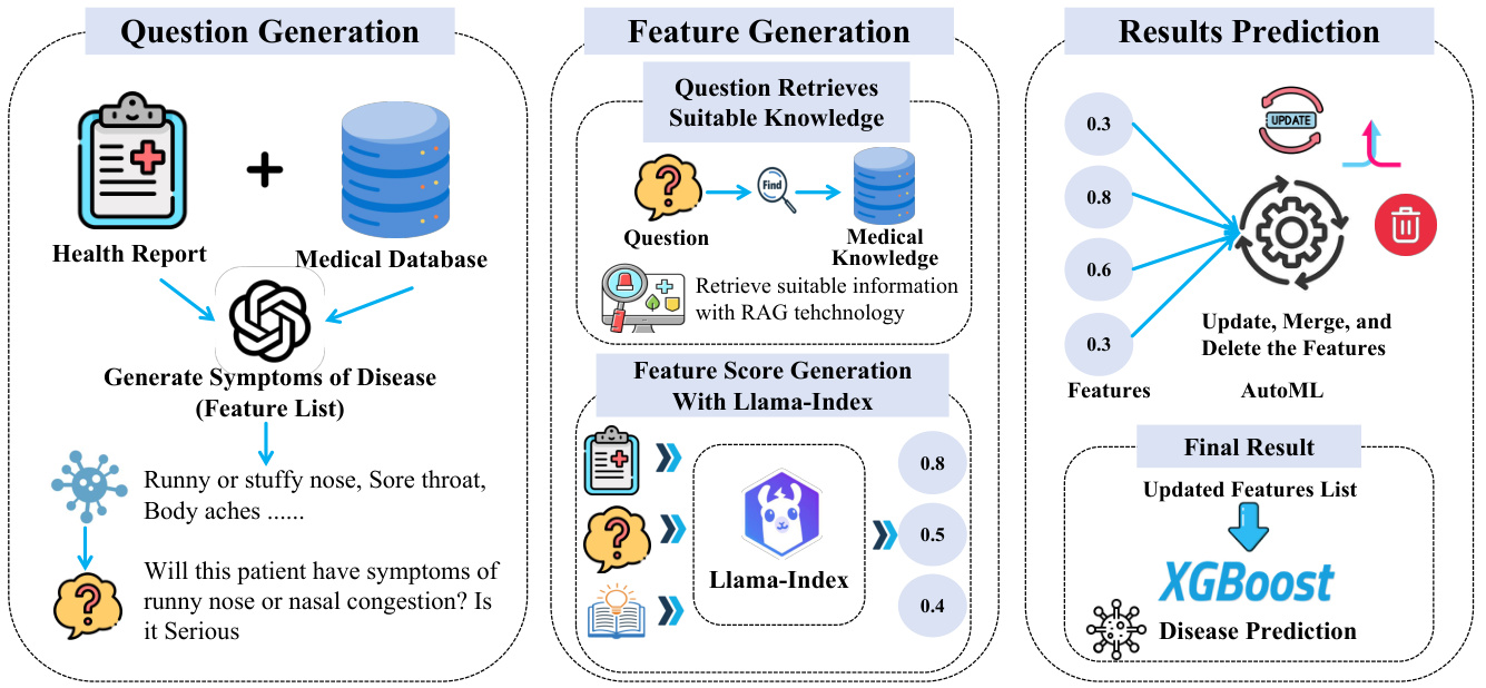 The significance of domain-specific knowledge incorporation has become clear in our quest to improve disease prediction through feature preprocessing. Addressing this, we use Context-Aware Automated Feature Engineering (CAAFE), which utilizes the power of LLMs (Hollmann et al., 2023) to generate features iterative ly with semantic relevance informed by the dataset's context. We have evolved from a semi-automated system to a fully automated one. We now use LLMs to autonomously craft feature and dataset descriptions, thereby streamlining the feature engineering process and enriching our models with con textually meaningful data. After the prediction is completed, we will query the LLM for the last time with the predicted diseases, and let it generate targeted health suggestions based on the health report and professional knowledge. The process detail is the same as the previous steps in Figure 3.