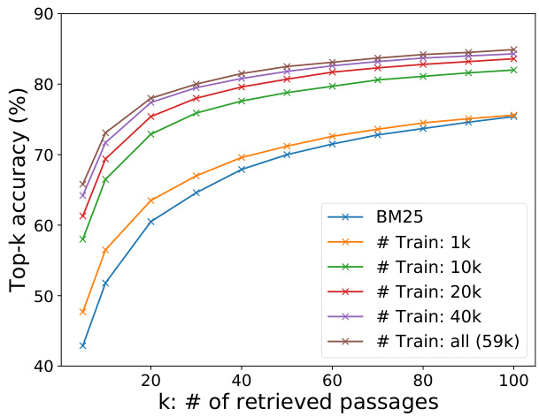 Sample efficiency We explore how many training examples are needed to achieve good passage retrieval performance. Figure 1 illustrates the top $k$ retrieval accuracy with respect to different numbers of training examples, measured on the development set of Natural Questions. As is shown, a dense passage retriever trained using only 1,000 examples already outperforms BM25. This suggests that with a general pretrained language model, it is possible to train a high-quality dense retriever with a small number of question–passage pairs. Adding more training examples (from 1k to 59k) further improves the retrieval accuracy consistently.