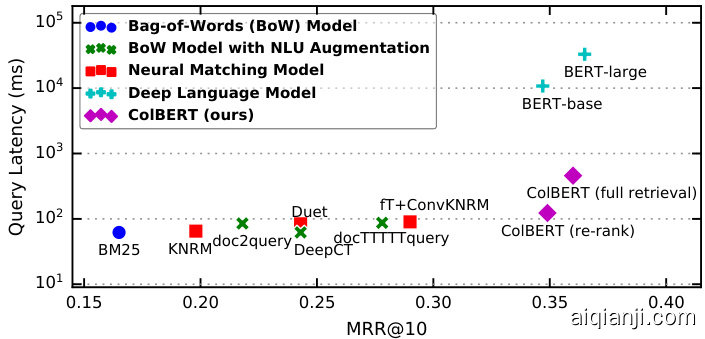 图 1: 多个代表性排序模型在 MS MARCO Ranking [24] 数据集上的有效性 $(\mathbf{MRR}@\mathbf{10})$ 与平均查询延迟 (对数尺度) 的关系对比。图中同时展示了 ColBERT 的表现。神经重排序模型基于官方 BM25 top-1000 结果运行,并使用 Tesla V100 GPU。具体方法和详细结果见 $\S4$。