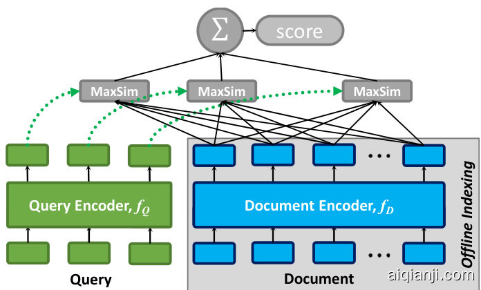 为了兼顾信息检索(IR)中的效率与上下文关联性,我们提出了ColBERT——一个基于BERT上下文交互延迟的排序模型。顾名思义,ColBERT提出了一种新颖的延迟交互范式来评估查询$q$与文档$d$之间的相关性。在延迟交互机制下,$q$和$d$被分别编码为两组上下文嵌入向量,并通过两组向量间支持剪枝的低成本计算(即无需穷举评估所有候选结果的快速运算)来实现相关性评估。