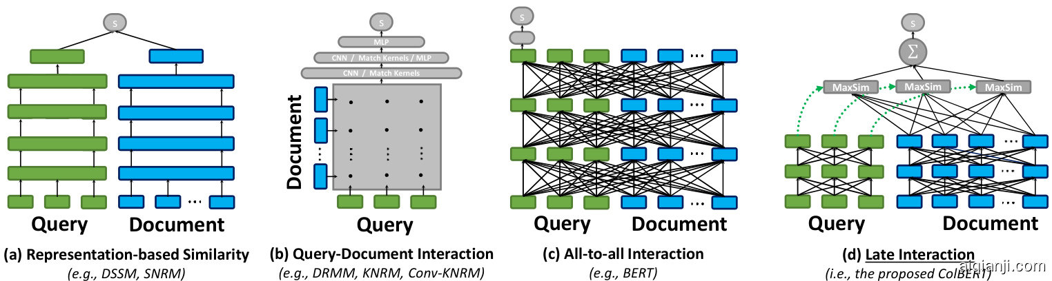 Figure 2 contrasts our proposed late interaction approach with existing neural matching paradigms. On the lef, Figure 2 (a) illustrates representation-focused rankers, which independently compute an embedding for $q$ and another for $d$ and estimate relevance as a single similarity score between two vectors [12, 41]. Moving to the right, Figure 2 (b) visualizes typical interaction-focused rankers. Instead of summarizing $q$ and $d$ into individual embeddings, these rankers model word- and phrase-level relationships across $q$ and $d$ and match them using a deep neural network (e.g., with CNNs/MLPs [22] or kernels [36]). In the simplest case, they feed the neural network an interaction matrix that refects the similiar it y between every pair of words across $q$ and d. Further right, Figure 2 (c) illustrates a more powerful interaction-based paradigm, which models the interactions between words within as well as across $q$ and $d$ at the same time, as in BERT’s transformer architecture [25].