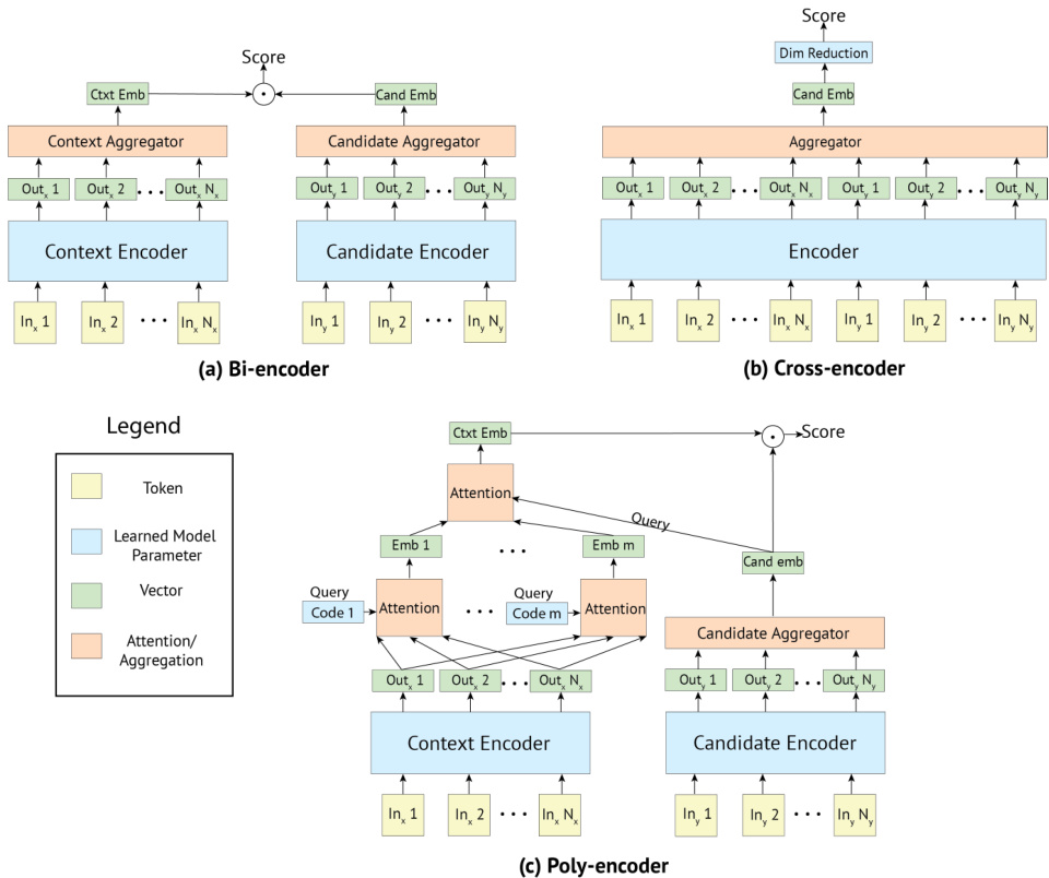 图 1: 我们考虑的三种模型架构示意图。(a) 双编码器(Bi-encoder)分别编码上下文和候选对象,允许在推理期间缓存候选表示。(b) 交叉编码器(Cross-encoder)在单个Transformer中联合编码上下文和候选对象,以更慢的计算速度为代价实现上下文与候选对象间更丰富的交互。(c) 多编码器(Poly-encoder)结合了双编码器和交叉编码器的优势,既允许缓存候选表示,又在计算最终得分前通过输入全局特征与给定候选对象间的最终注意力机制实现更丰富的交互。
