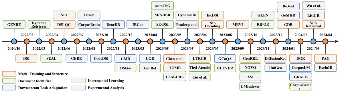 Recent studies on generative retrieval have delved into model training and structure [6, 153, 281, 307, 365, 369, 372], document identifier design [18, 265, 281, 288, 330], continual learning on dynamic corpora [80, 124, 192], downstream task adaptation [27, 28, 152], multi-modal generative retrieval [157, 178, 357], and generative recommend er systems [74, 233, 304]. The progress in GR is shifting retrieval systems from matching to generation. It has also led to the emergence of workshops [10] and tutorials [279]. However, there is currently no comprehensive review that systematically organizes the research, challenges, and prospects of this emerging field.