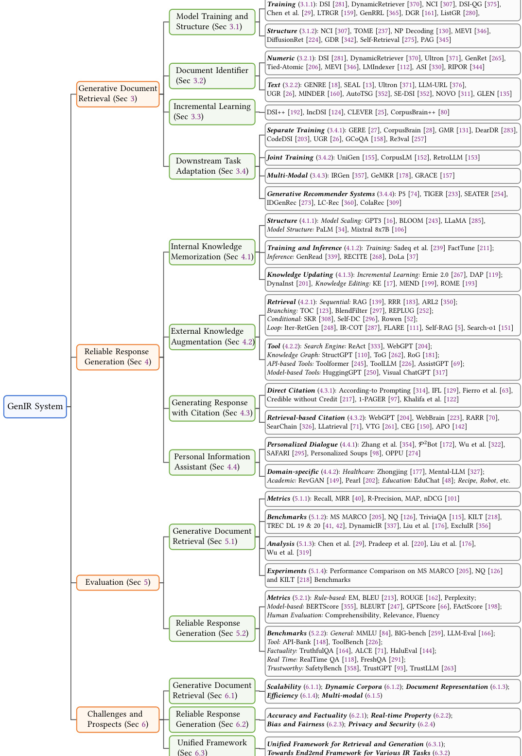 图 2: 生成式信息检索研究分类:涵盖生成式文档检索、可靠响应生成、评估方法、挑战与前景。
