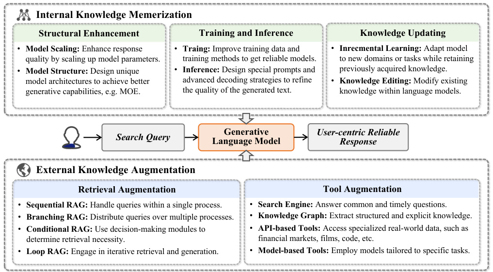 However, the responses generated by language models may not always be reliable. They have the potential to generate irrelevant answers [85], contradict factual information [90, 104], provide outdated data [291], or generate toxic content [93, 263]. Consequently, these limitations render them unsuitable for many scenarios that require accurate and up-to-date information. To address these challenges, the academic community has developed strategies across four key aspects: enhancing internal knowledge [16, 37, 56, 119, 132, 193, 243, 267, 285]; augmenting external knowledge [5, 113, 139, 151, 204, 245, 333]; generating responses with citation [129, 142, 156, 204, 314]; and improving personal information assistance [149, 172, 295, 327]. Despite these efforts, there is still a lack of a systematic review that organizes the existing research under this new paradigm of generative information access.