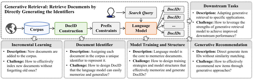 近期关于生成式检索的研究深入探讨了模型训练与结构[6,153,281,307,365,369,372]、文档标识符设计[18,265,281,288,330]、动态语料库的持续学习[80,124,192]、下游任务适配[27,28,152]、多模态生成式检索[157,178,357]以及生成式推荐系统[74,233,304]。生成式检索的进步正推动检索系统从匹配转向生成,并催生了专题研讨会[10]和教程[279]。然而,目前尚无系统梳理这一新兴领域研究进展、挑战与前景的全面综述。