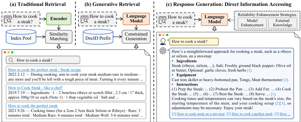 Reliable response generation is also a promising direction in the IR field, offering usercentric and accurate answers that directly meet users’ needs. Since LLMs are particularly adept at following instructions [359], capable of generating customized responses, and can even cite the knowledge sources [204, 223], making direct response generation a new and intuitive way to access information [54, 75, 241, 315, 367]. As illustrated in Figure 1, the generative approach marks a significant shift from traditional IR systems, which return a ranked list of documents (as shown in Figure 1(a,b)). Instead, response generation methods (depicted in Figure 1(c)) offer a more dynamic form of information access by directly generating detailed, user-centric responses, thereby providing a richer and more immediate understanding of the information need behind the users’ queries.