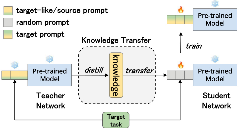 Figure 3: The architecture of our proposed KD-based prompt transfer method.