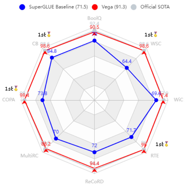 Figure 1: Vega v2 achieves state-of-the-art records on 4 out of 8 tasks among all submissions, producing the best average score of 91.3 and significantly outperforming the competitive official SuperGLUE Baseline (Wang et al., 2019a, BERT  $^{++}$  ).