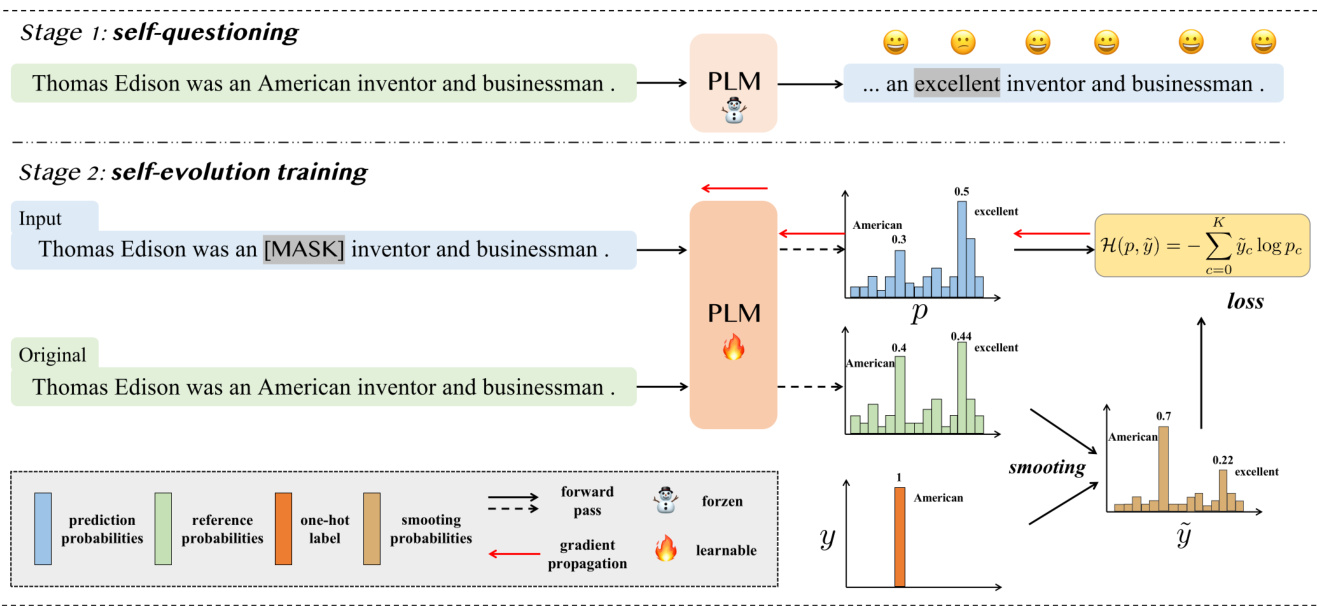 Stage 2 is self-evolution training. Given the neglected tokens (obtained in stage 1), we can select them for masking and then encourage the PLM to learn from these informative patterns, thus continuously improving the capability of the PLM. Intuitively, we can make the PLM learn how to predict these tokens, by minimizing the loss between the predicted probabilities and one-hot labels. However, considering the diversity of the neglected token, if we force the PLM to promote one specified ground truth over others, the other reasonable “ground truths” (for a given masking token, there can be more than one reasonable prediction) become false negatives that may plague the training process or cause a performance decrease (Li et al., 2022).