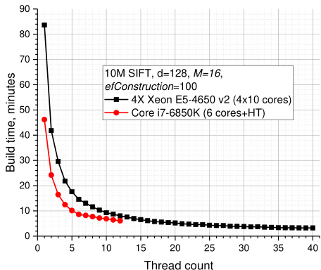 Fig. 9. Construction time for Hierarchical NSW on 10M SIFT dataset for different numbers of threads on two CPUs.