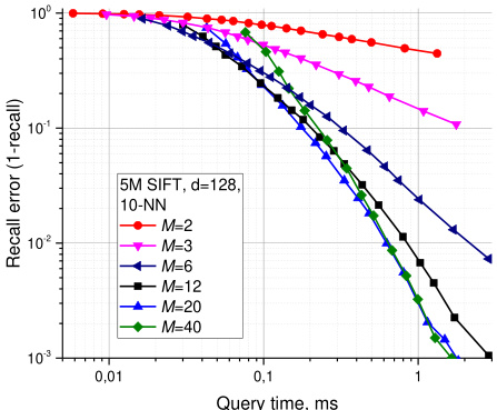 Fig. 8. Plots for recall error vs query time for different parameters of   $M$   for Hierarchical NSW on 5M SIFT learn dataset.