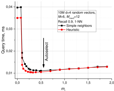 A simple choice for the optimal $m_{L}$ is $1/\ln(M),$ this corresponds to the skip list parameter $_ {p=1/M}$ with an average single element overlap between the layers. Simulations done on an Intel Core i7 5930K CPU show that the proposed selection of $m_{L}$ is a reasonable choice (see Fig. 3 for data on 10M random ${\mathrm{d}}{=}4$ vectors). In addition, the plot demonstrates a massive speedup on low dimensional data when increasing the $m_{L}$ from zero and the effect of using the heuristic for selection of the graph connections. It is hard to expect the same behavior for high dimensional data since in this case the $\mathbf{k}$ -NN graph already has very short greedy algorithm paths [28]. Surprisingly, increasing the $m_{L}$ from zero leads to a measurable increase in speed on very high dimensional data (100k dense random ${\mathrm{d}}{=}1024$ vectors, see plot in Fig. 4), and does not introduce any penalty for the Hierarchical NSW approach. For real data such as SIFT vectors [1] (which have complex mixed structure), the performance improvement by increasing the $m_{L}$ is higher, but less prominent at current settings compared to improvement from the heuristic (see Fig. 5 for 1-NN search performance on 5 million 128- dimensional SIFT vectors from the learning set of BIGANN [13]).