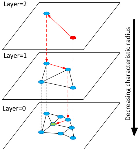 The idea of Hierarchical NSW algorithm is to separate the links according to their length scale into different layers and then search in a multilayer graph. In this case we can evaluate only a needed fixed portion of the connections for each element independently of the networks size, thus allowing a logarithmic s cal ability. In such structure the search starts from the upper layer which has only the longest links (the “zoom-in” phase). The algorithm greedily traverses through the elements from the upper layer until a local minimum is reached (see Fig. 1 for illustration). After that, the search switches to the lower layer (which has shorter links), restarts from the element which was the local minimum in the previous layer and the process repeats. The maximum number of connections per element in all layers can be made constant, thus allowing a logarithmic complexity scaling of routing in a navigable small world network.