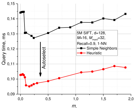Fig. 5. Plots for query time vs  $m_{L}$   parameter for 5M SIFT learn dataset. The auto selected value   $1/\mathsf{I n}(M)$   for  $m_{L}$   is shown by an arrow.
