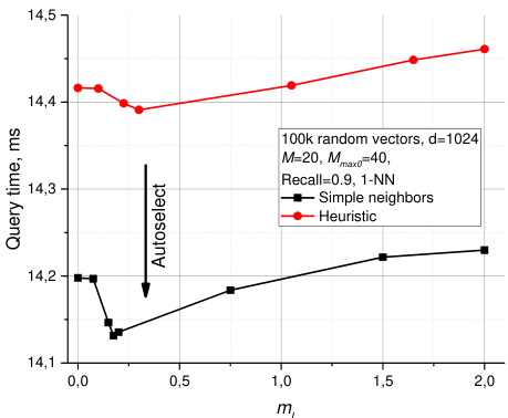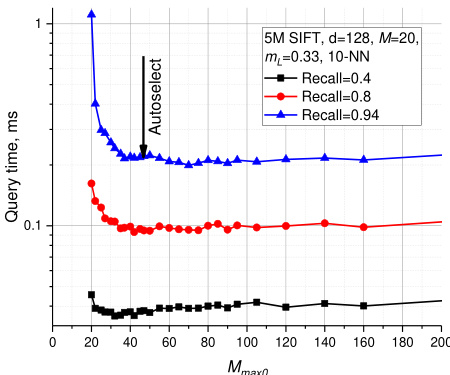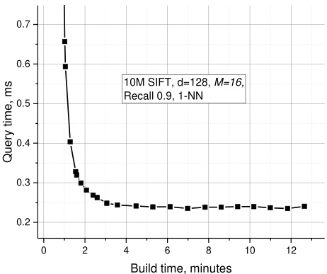 Selection of the ef Construction parameter is straight forward. As it was suggested in [26] it has to be large enough to produce K-ANNS recall close to unity during the construction process (0.95 is enough for the most usecases). And just like in [26], this parameter can possibly be auto-configured by using sample data.