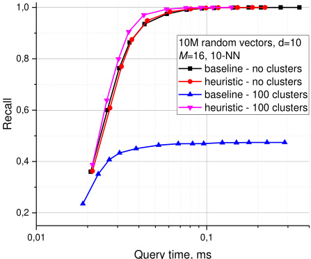 In all of the considered cases, use of the heuristic for proximity graph neighbors selection (alg. 4) leads to a higher or similar search performance compared to the naïve connection to the nearest neighbors (alg. 3). The effect is the most prominent for low dimensional data, at high recall for mid-dimensional data and for the case of highly clustered data (ideologically discontinuity can be regarded as a local low dimensional feature), see the comparison in Fig. 7 (Core i5 2400 CPU). When using the closest neighbors as connections for the proximity graph, the Hierarchical NSW algorithm fails to achieve a high recall for clustered data because the search stucks at the clusters boundaries. Contrary, when the heuristic is used (together with candidates’ extension, line 3 in Alg. 4), clustering leads to even higher performance. For uniform and very high dimensional data there is a little difference between the neighbors selecting methods (see Fig. 4), possibly due to the fact that in this case almost all of the nearest neighbors are selected by the heuristic.