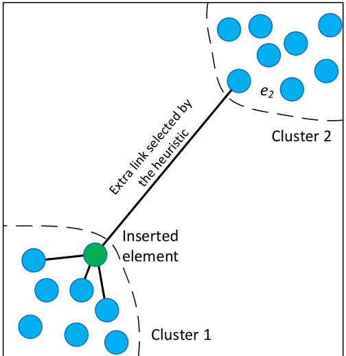 Fig. 2. Illustration of the heuristic used to select the graph neighbors for two isolated clusters. A new element is inserted on the boundary of Cluster 1. All of the closest neighbors of the element  belong to the Cluster 1, thus missing the edges of Delaunay graph  between the clusters. The heuristic, however, selects element   $\scriptstyle{e_{2}}$  from Cluster 2, thus, maintaining the global connectivity in case the  inserted element is the closest to  $\boldsymbol{e}_{2}$   compared to any other element  from Cluster 1.