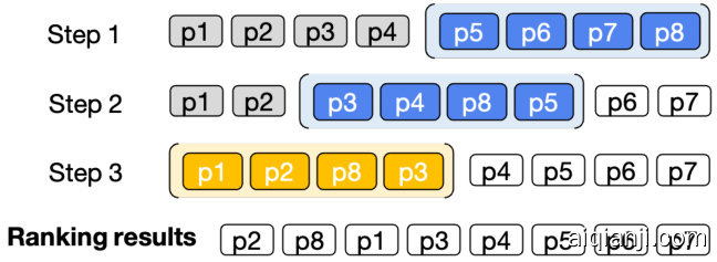图 3: 使用窗口大小为4、步长为2的滑动窗口对8个段落进行重排序的示意图。蓝色表示前两个窗口,黄色表示最后一个窗口。滑动窗口按从后到前的顺序应用,即前一个窗口的前2个段落将参与下一个窗口的重排序。