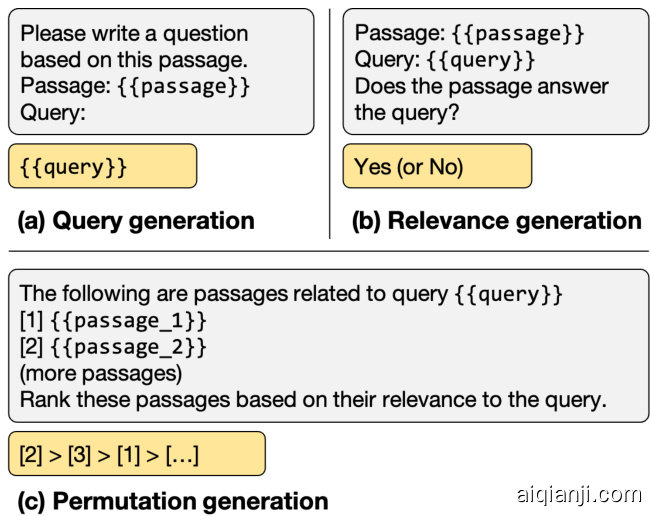 图 2: 使用大语言模型进行零样本段落重排序的三种指令类型。灰色和黄色区块分别表示模型的输入和输出。(a) 查询生成依赖大语言模型根据段落生成查询的对数概率。(b) 相关性生成指导大语言模型输出相关性判断。(c) 排列生成针对一组段落生成排序列表。详见附录A。