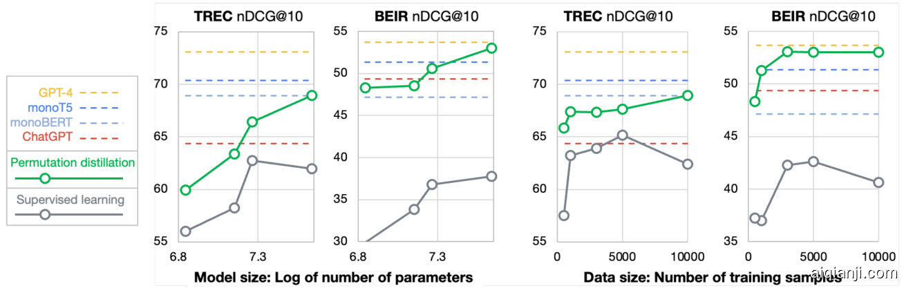 我们的评估结果表明,配备零样本指令排列生成的GPT-4在几乎所有数据集上都超越了监督系统。图1显示,GPT-4在TREC、BEIR和My.TyDi上的平均nDCG分别提升了2.7、2.3和2.7,优于之前的先进模型。此外,GPT-4在新推出的NovelEval测试集上实现了最先进的性能。通过排列蒸馏实验,我们发现一个435M参数的学生模型在BEIR上的平均nDCG比之前的先进monoT5 (3B)模型提升了1.67。同时,所提出的蒸馏方法还展现出成本效益优势。