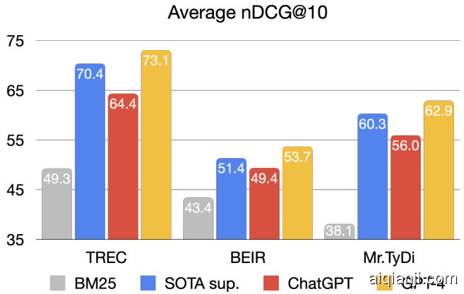 Figure 1: Average results of ChatGPT and GPT-4 (zero-shot) on passage re-ranking benchmarks (TREC, BEIR, and Mr.TyDi), compared with BM25 and previous best-supervised systems (SOTA sup., e.g., monoT5 (Nogueira et al., 2020)).