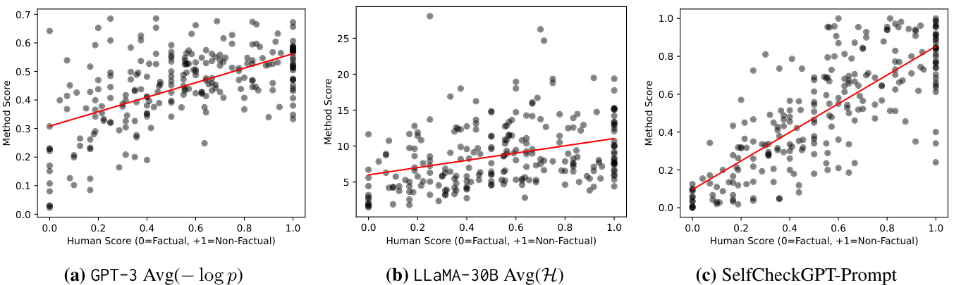 图 6: 段落级分数散点图,其中 Y 轴 $=$ 方法得分,X 轴 $=$ 人工评分。相关性数据见表 2。其他 Self Check GPT 变体的散点图见附录中的图 10。