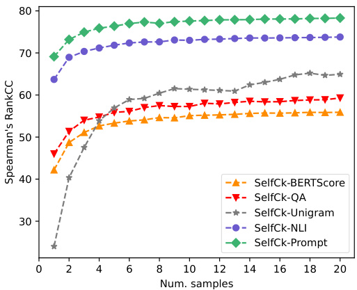 Figure 7: The performance of Self Check GP T methods on ranking passages (Spearman’s) versus the number of samples.