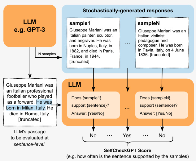 Figure 1: Self Check GP T with Prompt. Each LLM-generated sentence is compared against stochastic ally generated responses with no external database. A comparison method can be, for example, through LLM prompting as shown above.