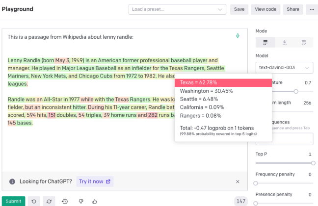 Figure 2: Example of OpenAI’s GPT-3 web interface with output token-level probabilities displayed.