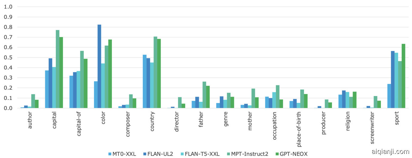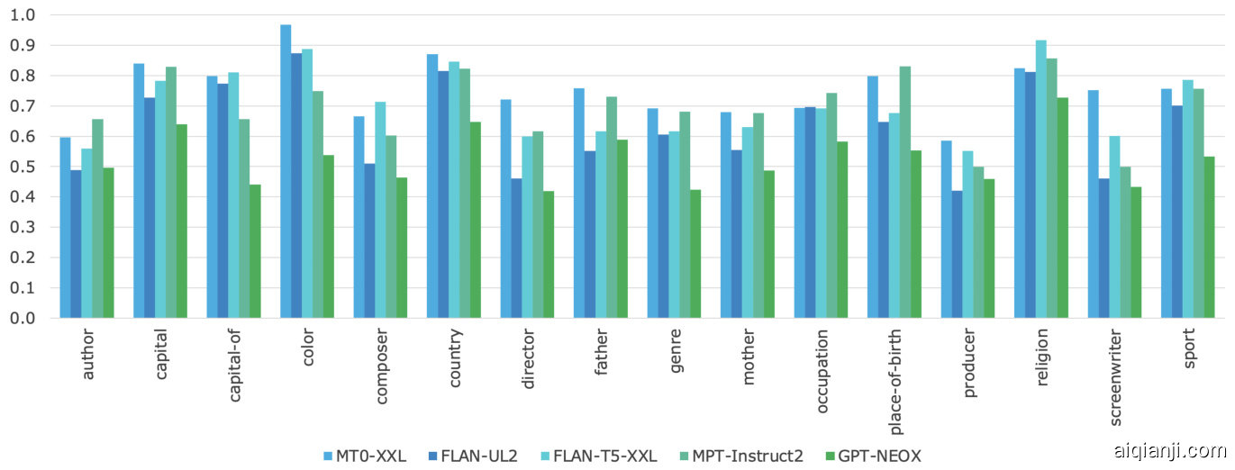 PopQA的部分问题类别包含相同基础类型的主题,而其他类别的主题类型可能各不相同。例如,职业类问题的主题都是人物,首都类问题的主题都是州、省或国家等。在宗教类问题中,有些主题是人物(如Rumi或Paul,也包括像Bertrand Russell这样非宗教领袖的人物)、民族或国家群体(如瑞典人、阿拉伯人)、机构(如Boston College),或是其他杂项主题(如圣人、波旁复辟、圣母升天)。因此,对于某些主题,将宗教问题表述为"遵循"什么宗教会更符合语法,而对于其他主题,则更适合问"关联"什么宗教。需要注意的是,这种语法上的不协调性原本就存在于PopQA中,因此我们的改写模板旨在涵盖所有可能的含义。尽管如此,我们期望一个好的模型能够智能地回答这些问题,而不会因轻微的语法不协调而受阻。