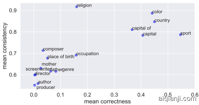 模型的一致性(consistency)通常定义为在输入保持语义不变的情况下,其行为表现的不变性(Elazar et al., 2021; Raj et al., 2022)。显然,一致性是大语言模型高度期望具备的特性,能提升其安全性、鲁棒性和可信度。本文探讨大语言模型在开放域零样本事实问答中的事实一致性问题。举例而言,一个具备一致性的模型对于问题集{"Stevie Cameron的职业是什么?","Stevie Cameron从事什么工作?","Stevie Cameron以什么谋生?"}会给出相同答案。模型的一致性指标定义与答案准确性无关(Elazar et al., 2021),这意味着语义等价(可能不正确)的输出仍被视为一致。因此,虽然上述问题的正确答案是"记者",但三个相同的错误答案(如"政治家")仍会被判定为完全一致。