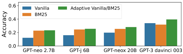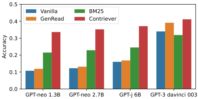 Retrieval largely improves performance. Figure 7 shows that augmenting LMs with nonparametric memories significantly outperforms unassisted vanilla LMs. A much smaller LM (e.g., GPT-Neo 2.7B) augmented by the Contriever retrieval results outperforms vanilla GPT-3. Large LMs such as GPT-3 also enjoy the benefits of nonparametric memories. Contriever gives $7%$ accuracy gains on top of GPT-3 davinci-003. Gen