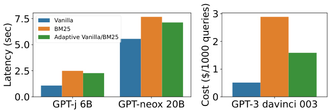 图 11: 在我们机器上运行的大型 GPT-neo 模型的 POPQA 延迟,以及 GPT3 的 API 成本。自适应检索降低了延迟和 API 成本。
