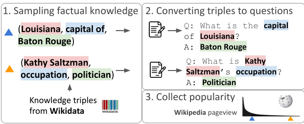 Figure 2: POPQA is created by sampling knowledge triples from Wikidata and converting them to natural language questions, followed by popularity calculation.
