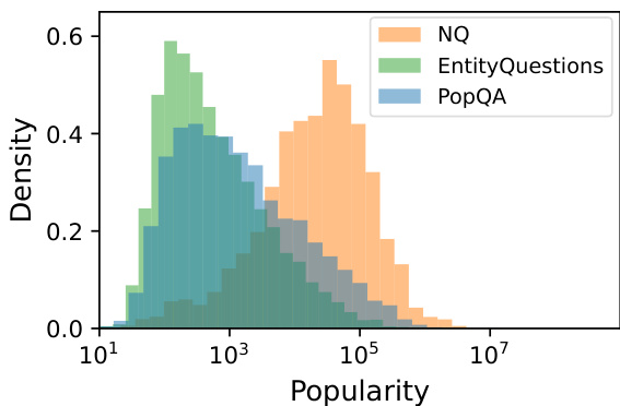 Figure 3: Distribution of subject entity popularity for Ent it y Questions, POPQA, and for NQ-open for reference. Details on NQ entities can be found in Appendix A.