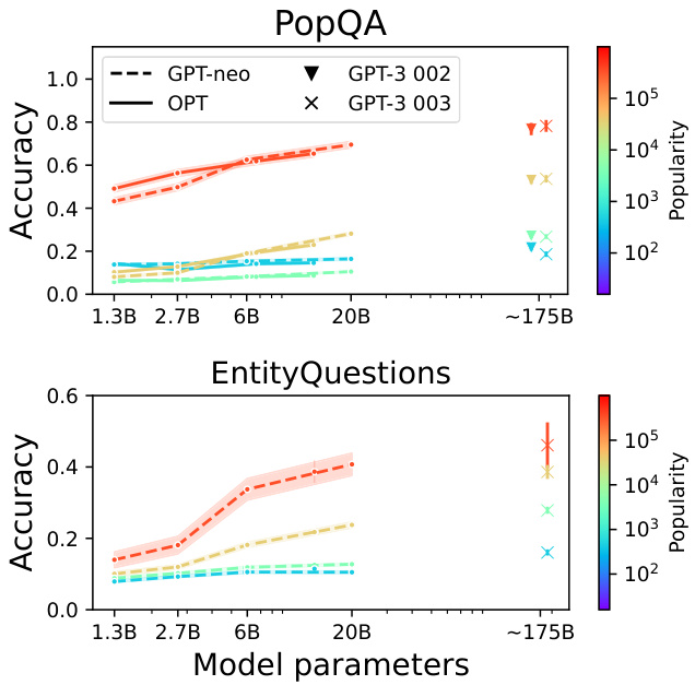 On both datasets, LMs’ memorization $(R Q_{1})$ is often limited to the popular factual knowledge and even GPT-3 davinci-003 fails to answer the majority of the long-tail questions. Moreover, on such questions, scaling up models does not significantly improve the performance (e.g., for the 4,000 least popular questions in POPQA, GPT-j 6B has $16%$ accuracy and GPT-3 davinci-003 has $19%$ accuracy). This also suggests that we can predict if LMs memorize certain knowledge based on the information presented in the input question only.