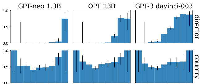 关系类型结果细分。图 6 详细展示了流行度、准确性与关系类型之间的关联:它呈现了导演和国家两类关系的模型准确率随流行度分布的变化情况。在前两种类型中,我们可以观察到模型准确率与流行度之间存在明显的正相关趋势,且随着模型规模增大,大语言模型的记忆能力也随之增强。相比之下,在"国家"关系类型中,所有模型均未表现出趋势性变化,但整体准确率较高,这表明大语言模型常利用数据伪影来回答冷门问题。我们在附录C.3节展示了示例模型的预测结果。