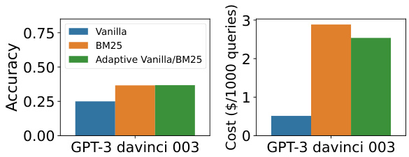 图 12: 实体问题自适应检索(Adaptive Retrieval)的准确性与成本节约。尽管实体问题缺乏热门实体(见图 3),自适应检索仍能在保持与纯检索相当性能的同时,将API成本降低15%。