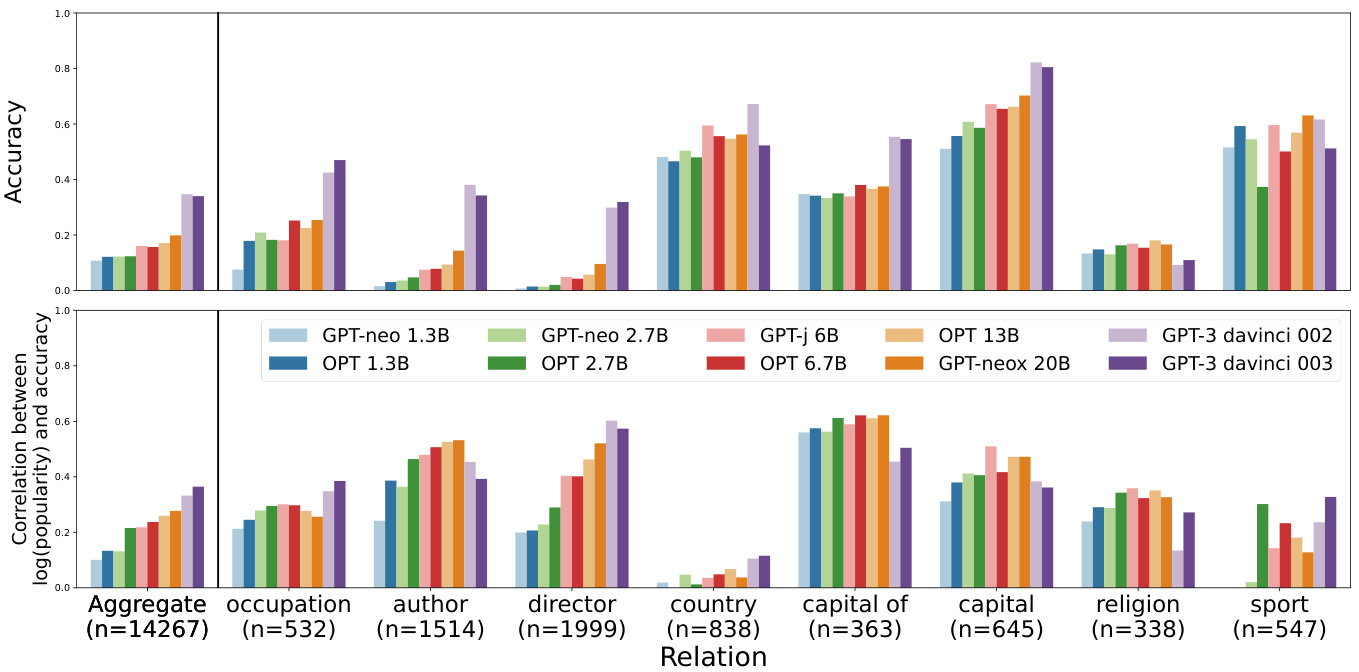 Subject entity popularity predicts memorization. Figure 4 (bottom) shows that there is a positive correlation between subject entity popularity and models’ accuracy for almost all relationship types. This supports our hypothesis that subject entity popularity can be a reliable indicator of LMs’ factual knowledge memorization. In general, the correlations between subject entity popularity and accuracy are stronger for larger LMs; GPT-3 003 shows the highest positive correlation (roughly 0.4) while GPT-Neo-1.3B shows relatively weak positive correlations (approximately 0.1).