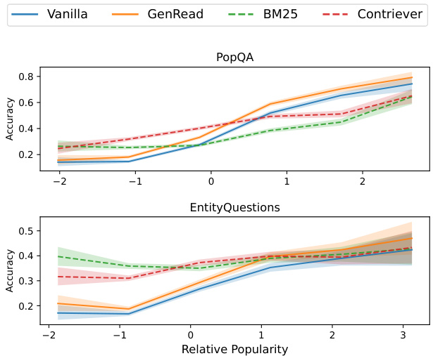 Non-parametric memories are effective for less popular facts. How does retrieval augmentation lead to such significant improvements? Figure 8 shows the relationship between the entity popularity and models’ QA performance. It can be seen that retrieval-augmented LMs guided by Contriever or BM25 have a clear advantage over unassisted vanilla LMs, especially on less popular entities, resulting in a significant performance gain. Overall, Contriever-guided LMs outperform BM25-based ones on POPQA, while the BM25-based models perform better on the least popular entities, consistent with the findings from Sciavolino et al. (2021). On the other hand, for more popular entities, parametric knowledge shows equal or higher accuracy, indicating that the state-of-the-art LMs have already memorized the answers, and augmenting input with retrieved-context doesn’t help much or even hurts the performance. Interestingly, GenRead generally outperforms vanilla LMs despite relying on LMs’ parametric memory. This demonstrates the effectiveness of elicitive prompting (Wei et al., 2022; Sun et al., 2022) as observed in prior work. However, like vanilla LMs, GenRead shows low performance on less popular entities.