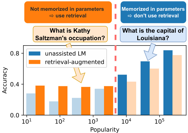 本研究通过大规模知识探测实验,检验了大语言模型(LM)依赖参数记忆事实知识的有效性及局限,并探究影响事实知识记忆的关键因素。实验结果表明:记忆强度与实体流行度显著相关,在长尾分布上扩大模型规模仅能带来边际收益;非参数化记忆虽能有效提升模型对长尾知识的处理能力,但会干扰模型对知名实体的判断(因为强大LM已将其编码至参数中)。基于这些发现,我们设计了高效的自适应检索(Adaptive Retrieval)机制,通过实体流行度和关系类型的启发式规则实现按需检索。实验证明该方法不仅性能优于纯LM或传统检索增强型LM,还具有更高计算效率。