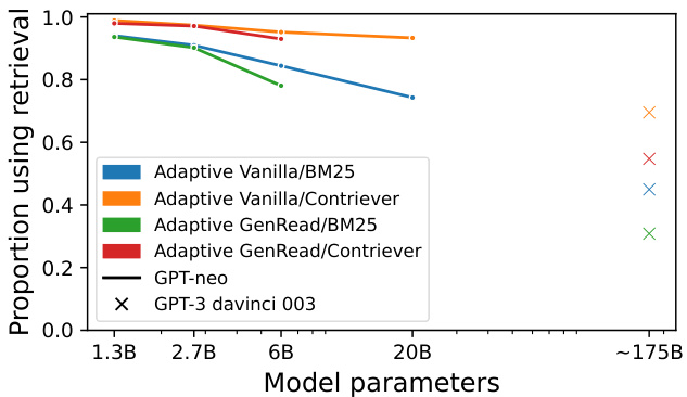 The threshold shifts with LM scale. While Adaptive Retrieval shows performance gains for larger models, smaller models do not realize the same benefits; as shown in Figure 9, the performance gain from Adaptive Retrieval is much smaller when we use models smaller than 10 billion. Why does this happen? Figure 10 shows that smaller LMs almost always retrieve, indicating that there are not many questions for which small LMs’ parametric knowledge is more reliable than non-parametric memory. In contrast, large models typically retrieve much less. For example, GPT3 davinci-003 only retrieves for $40%$ of questions when paired with BM25, and even the much smaller GPT-neox 20B does not retrieve documents on more than $20%$ of the questions. On EntityQuestions (Appendix Figure 15) all of the LMs retrieve much more, as the questions are mostly about less popular entities.