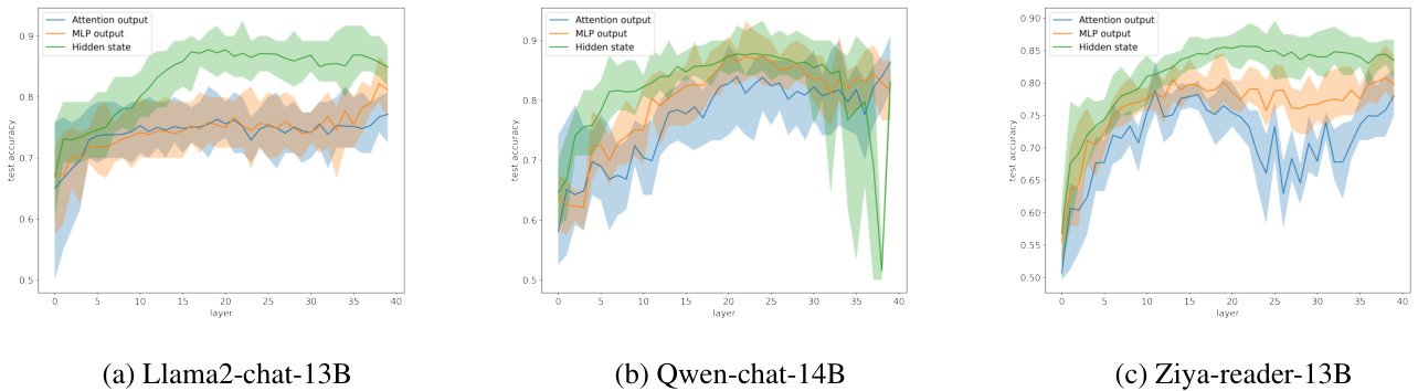 The attention output, which refers to the output of the dot product attention and before the attention linear layer in the decoder layer. This setup aligns with the probe’s positioning within Li et al. (2023b); The MLP output, i.e., the feed-forward layer’s output within the decoder layer, occurring prior to residual linkage; The hidden states, defined as each decoder layer’s output.