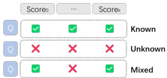 分数经过归一化处理并求和,为每个生成结果提供总体事实性评分。随后,根据总分是否高于或低于中位数,将生成结果分别归类为"正确"或"错误"。问题则根据多轮生成中回答的一致性被划分为"已知"、"未知"或"混合"三类——若回答持续正确归为"已知",持续错误归为"未知",正确与错误混杂时归为出现频率较低的"混合"类别。