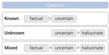 这些类别对应如图3所示的三个排序层次:已知(对应图1中的状态1):事实性 $>$ 不确定性;混合(状态2):事实性 $>$ 不确定性 $>$ 幻觉;未知(状态4):不确定性 $>$ 幻觉。其中,"事实性"指事实性得分最高的生成内容,"幻觉"则表示得分最低的生成内容。