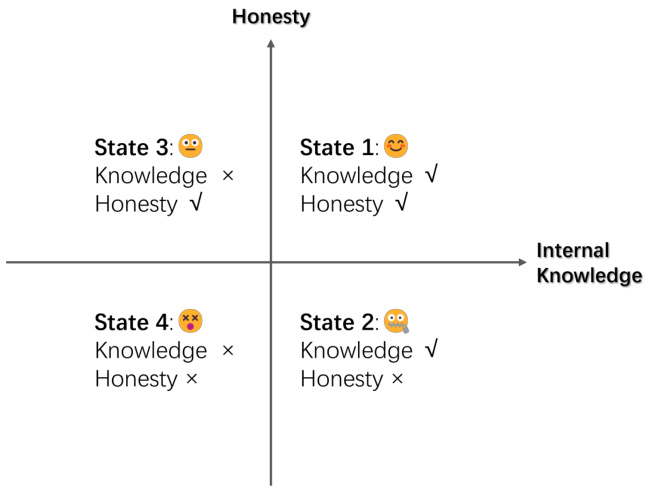 For a given question that requires factual knowledge, the model output can be classified into one of four states, depending on the model’s internal knowledge and its honesty. These states are illustrated in Figure 1: