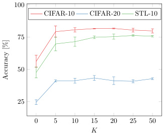 Number of neighbors. Figure 7 shows the influence of using a different number of nearest neighbors $K$ during the clustering step. The results are not very sensitive to the value of $K$ , and even remain stable when increasing $K$ to 50. This is beneficial, since we do not have to fine-tune the value of $K$ on very new dataset. In fact, both robustness and accuracy improve when increasing the value of $K$ upto a certain value. We also consider the corner case $K=0$ , when only enforcing consistent predictions for images and their augmentations. the performance decreases on all three datasets compared to $K=5$ , $56.3%$ vs $79.3%$ on CIFAR10, $24.6%$ vs $41.1%$ on CIFAR100-20 and $47.70%$ vs $69.8%$ on STL10. This confirms that better representations can be learned by also enforcing coherent predictions between a sample and its nearest neighbors.
