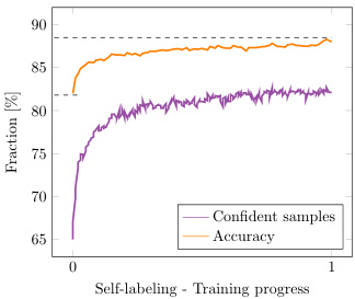 Fig. 4: Acc. and the number of confident samples during self-labeling.